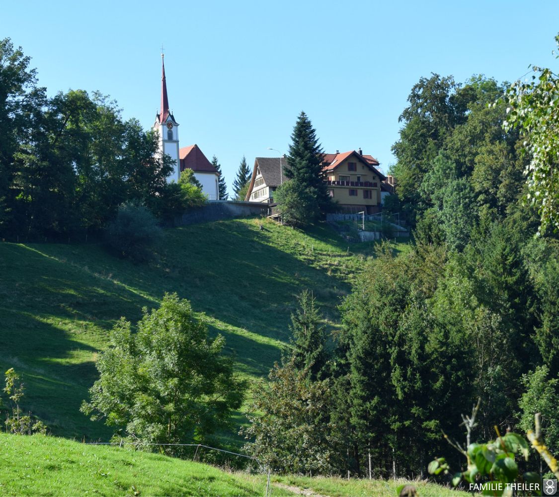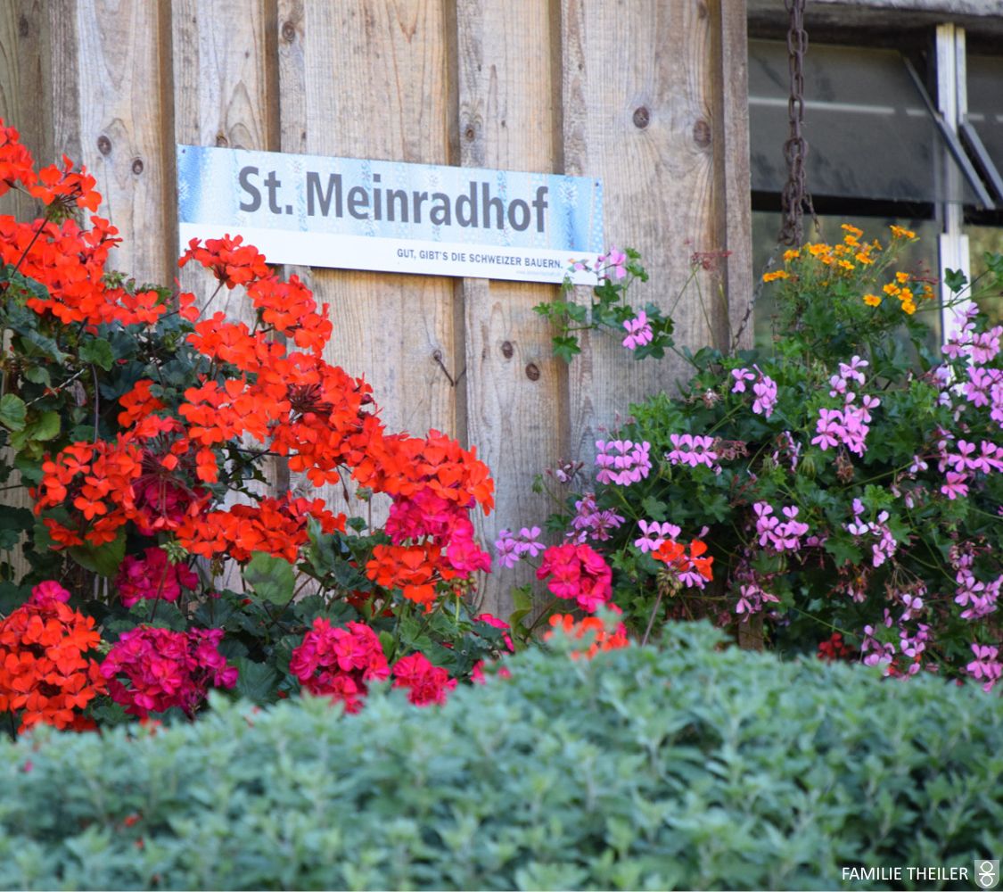 Der Weg des Heiligen Meinrads von Einsiedeln wird bis heute mit einer hofeigenen Kapelle geehrt. Er ist der Namensgeber unseres St. Meinradhofes. Das Schild am Hofeingang zeigt das Familienwappen der Theilers.